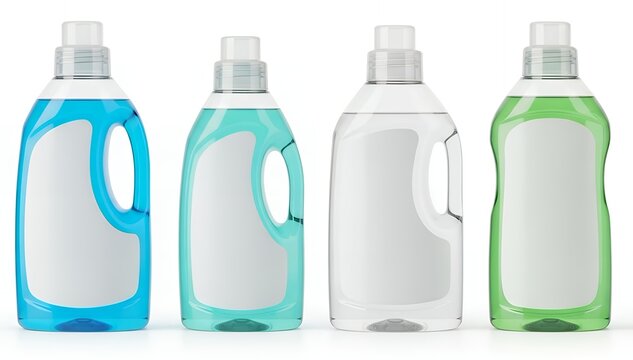 Collection of colorful laundry detergent or fabric softener bottles with blank labels for branding, isolated on white background.