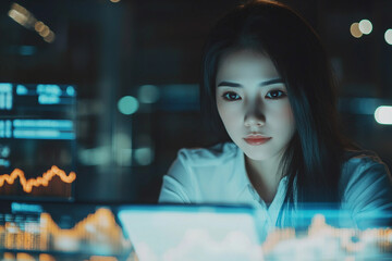 Business professional analyzing data late at night