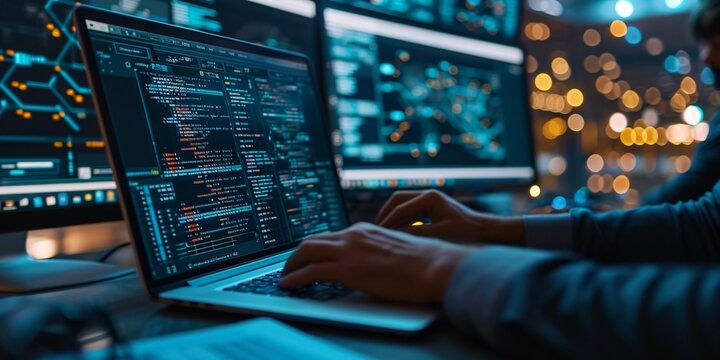 Concept of digital technology and data science: a computer engineer programming on a laptop to manage and control data exchange in AI business and machine learning contexts.