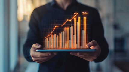 Business person holding futuristic tablet displaying financial graph for corporate growth and success