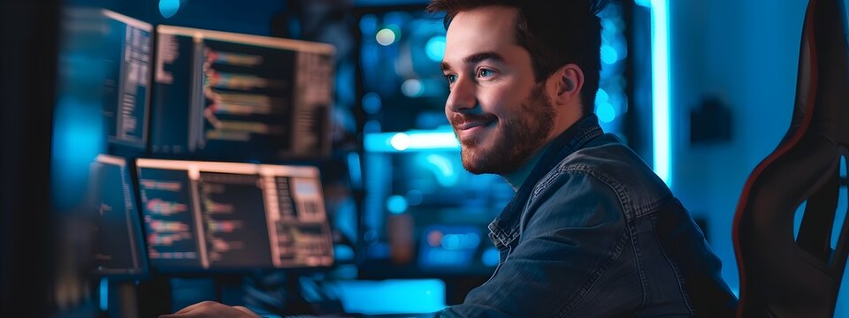 Night Shift Software Developer: A focused developer, illuminated by the glow of computer screens, works late into the night, showcasing dedication and technical prowess.