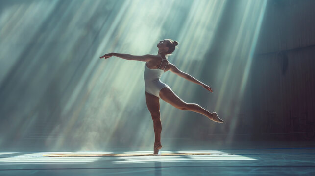 Graceful ballet dancer striking a pose in a sunlit studio, with dramatic light rays highlighting her form.