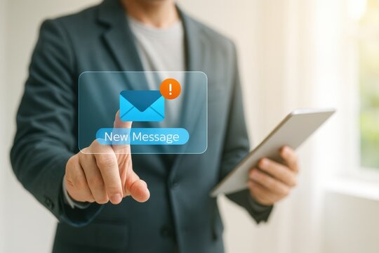 Sending instant notifications business professional engages with new message alert in modern office environment