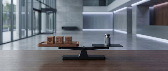 Human resources business ethics and professional organizational balance with wooden blocks and engraved icons for corporate integrity and management