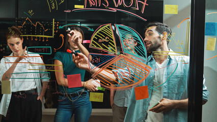 Group of four professional multiracial businessmen and businesswomen brainstorming and discussing by writing graph with a marker on glass wall to explain company financial status to plan strategy