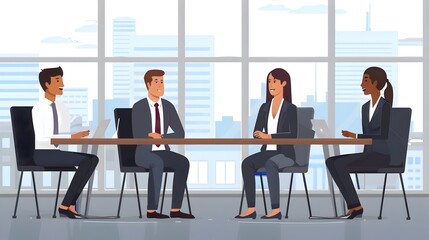 A professional setting featuring a man seated with his back to the camera, facing a panel of three individuals in business attire.