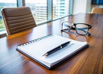 A professional desk setup with a notepad, pen, and glasses, highlighting the atmosphere of a formal job interview and hiring process in a corporate setting.