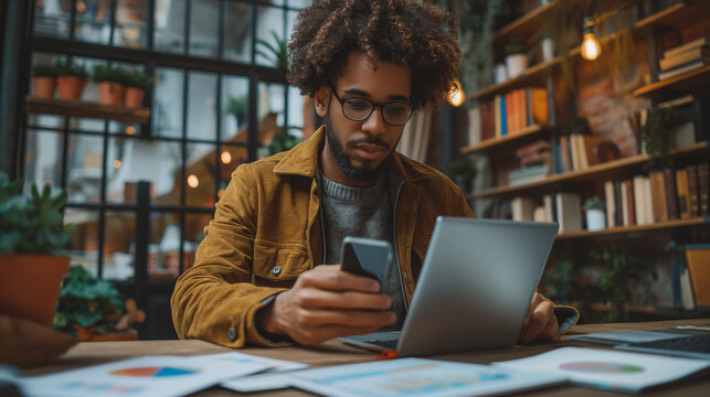 Emotional intelligence skills concept. Man using smartphone in a modern café setting.