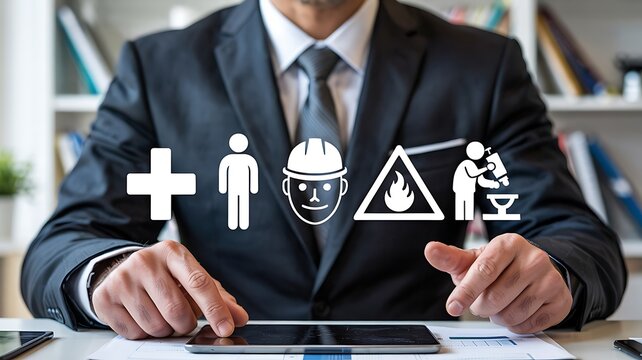 Business professional using a tablet with icons representing health safety environment and industrial work in a modern office setting