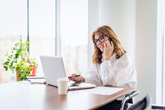 Smiling businesswoman talking on mobile phone and writing in diary while working at office desk