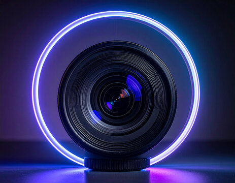 A high-quality professional camera lens is positioned directly in front of a glowing neon circular light ring.