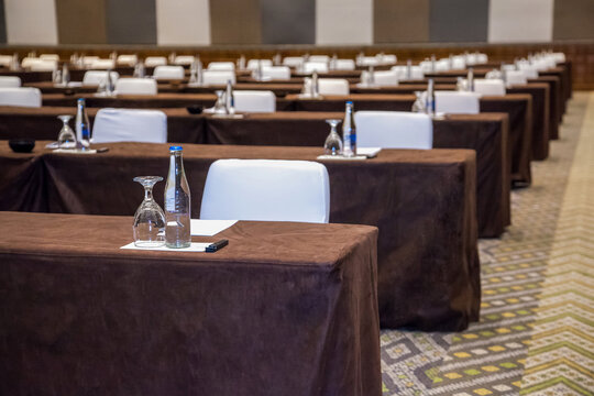 Empty convention center set up with tables, chairs, water, papers and pen for conference, business meeting, training course, lectures or seminars
