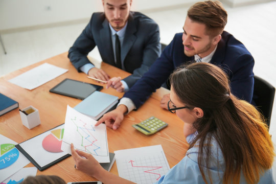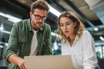 Focused project manager and marketing analyst collaborating on laptop in office setting. Concept for business presentation, teamwork solution and corporate strategy meeting