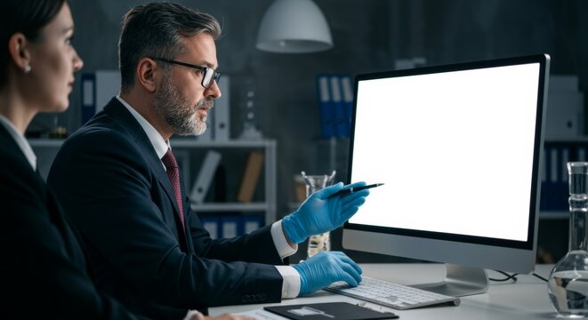 Analyzing a Laptop: Two figures collaborate, analyzing a laptop on a clean, modern desk in an inviting office setting, where efficiency and innovation thrives.