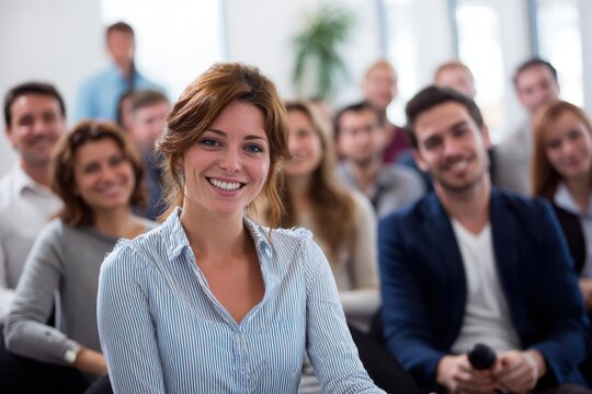 A confident business presenter, with clear eyes, addresses his audience in a professional business environment, and is focused on sharing insight.