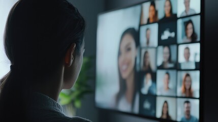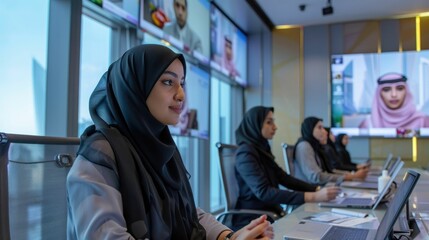 Businesspeople engaging in a video conference, sharing ideas and collaborating during an online meeting in a modern office setting with advanced technology