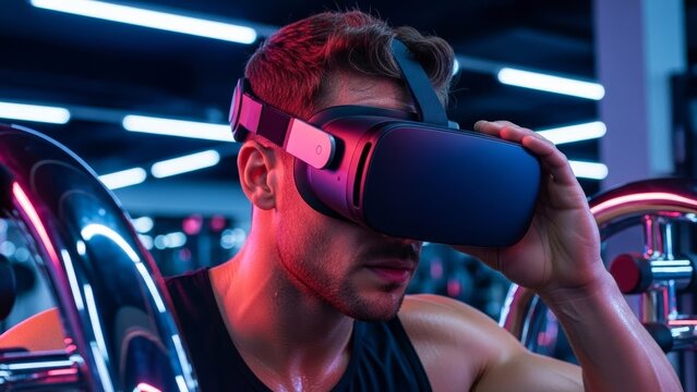 A muscular man in athletic wear experiencing VR in gym equipment, with colorful neon lighting, as a fitness professional in a workout space.