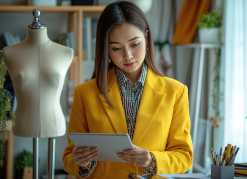 Asian female fashion designer using digital tablet in her studio