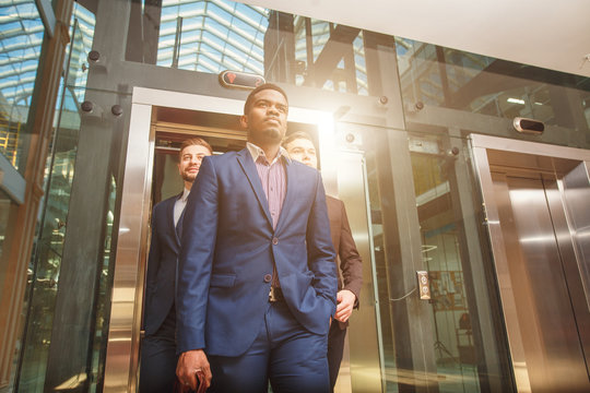 Diverse professionals exiting elevator in corporate office group portrait urban environment upbeat mood