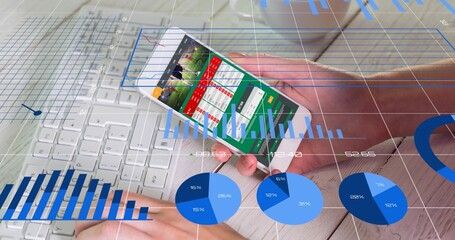 Tapping man's beige-sleeved hands holding phone on white keyboard at desk, with bar and pie charts