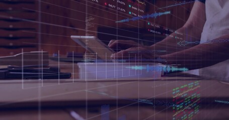 Close-up of hands typing on a keyboard, illustrated with a graph overlay that symbolizes business growth and data analysis in a digital environment. Copula