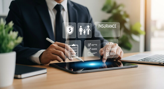 Digital insurance policy management interface showing business professional using tablet for secure coverage planning and modern financial services workflow