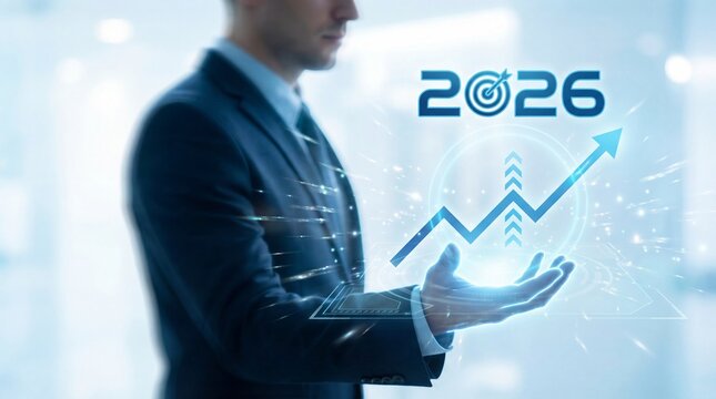 Business professional using futuristic digital interface to analyze growth trends and technology advancements for 2026