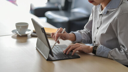 Close-up of young businesswoman hand holding pen using tablet keyboard at office.