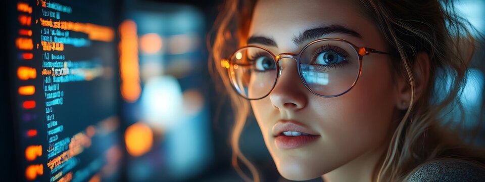 Female technician analyzing data streams in server room