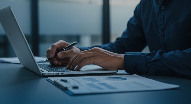 A businesswoman in a modern office setting is focused while working on a laptop and reviewing documents at her desk, analyzing data.