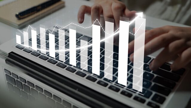 A business professional hands typing on a keyboard, surrounded by a virtual graph overlay symbolizing finance growth and digital innovation in a modern office setting. Scalp