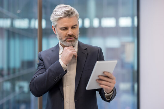 Businessman wearing a suit and shirt, standing in a contemporary office setting, thoughtfully analyzing data on a digital tablet while holding his chin