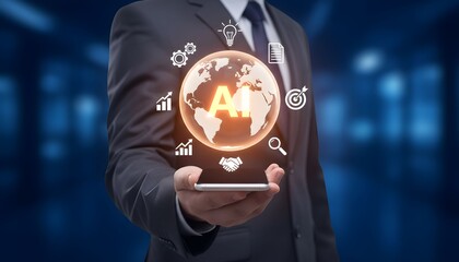 Business professional in formal suit interacting with digital icons representing technology innovation and connectivity in modern office environment