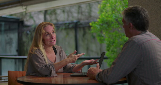 Female professional explaining idea to male coworker during team meeting in open office setting with laptop on table