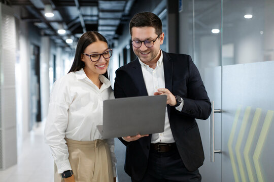 Two professionals collaborate over laptop in a modern workspace during a productive day