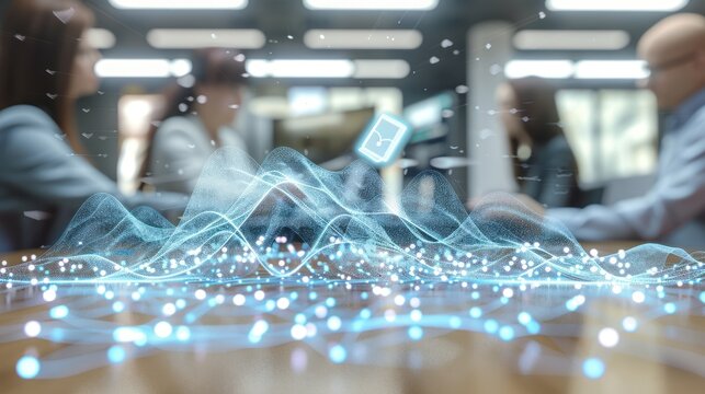 Tech professionals discussing data on transparent display