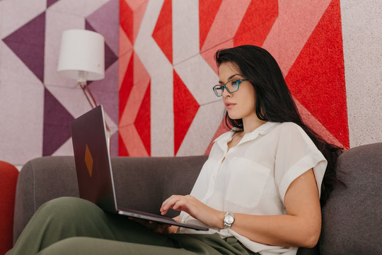 Concentrated woman working on laptop in modern office environment