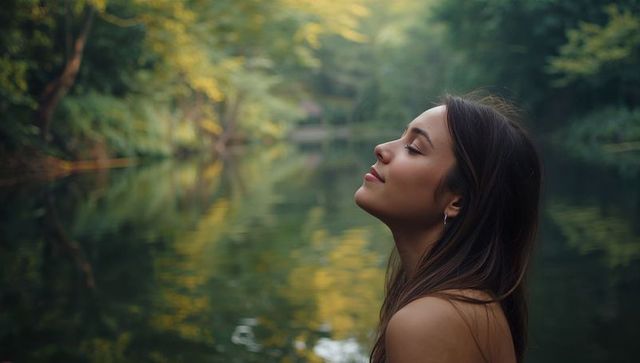 Exhaling woman releasing glowing vapor stream in profile, ethereal luminescent particles
