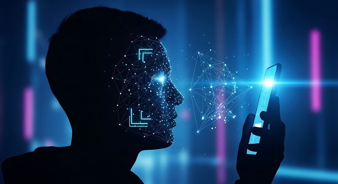 A person with closed eyes is engaged in facial recognition technology. An overlay of geometric shapes indicates the mapping of facial features for identification purposes.