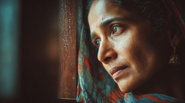A portrait of a woman looking thoughtfully out the window, evoking introspection and contemplation