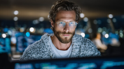 Coding Software engineer debugging a program with data and algorithms on the screen.