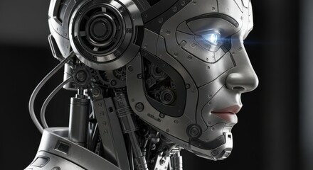 An advanced, androgynous robot contemplates its surroundings, illuminated by soft lighting, revealing intricate details in its design.