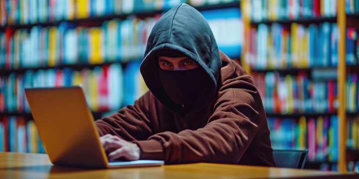 a hacker hiding his face in a library hacks personal data through a laptop, against the backdrop of bookshelves
