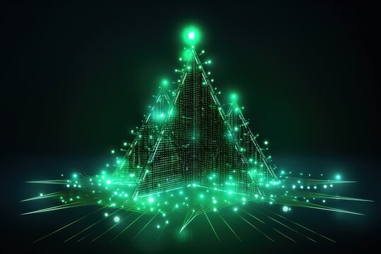 futuristic glowing green christmas tree , digital electronic programming neon code with green lines and dots, science and technology, Glowing rays with flickering particles , New year banner .