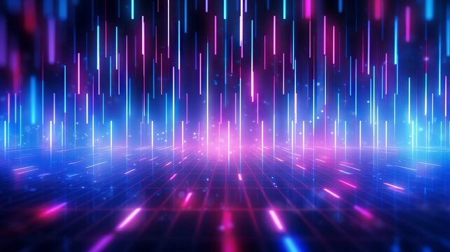 Pink and blue neon lines with bokeh lights on dark background. Abstract digital art for data transfer and technology concepts.