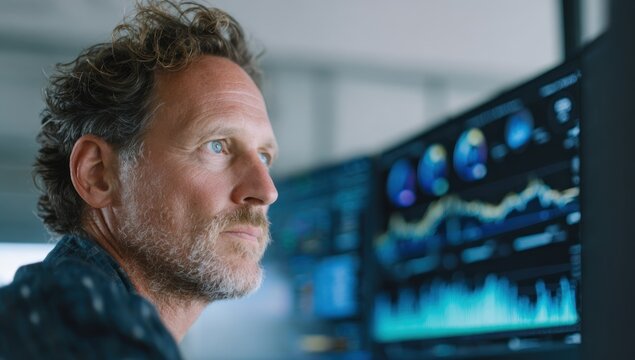 Futuristic digital interface with data visualization, graphs, and charts in dark theme.