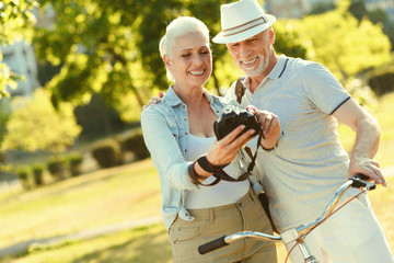 Couple checking fitness progress in home gym with tape measure