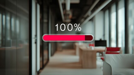 Office interior blurred background, progress bar indicates completion with bright red color against a white text