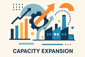 Business growth strategy with upward arrows, factory icons, and progress charts growth expansion.