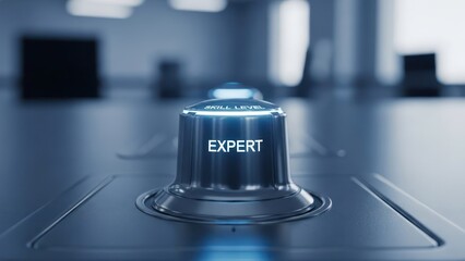Close-up of a knob with "EXPERT" label. Shallow depth of field; blue-toned